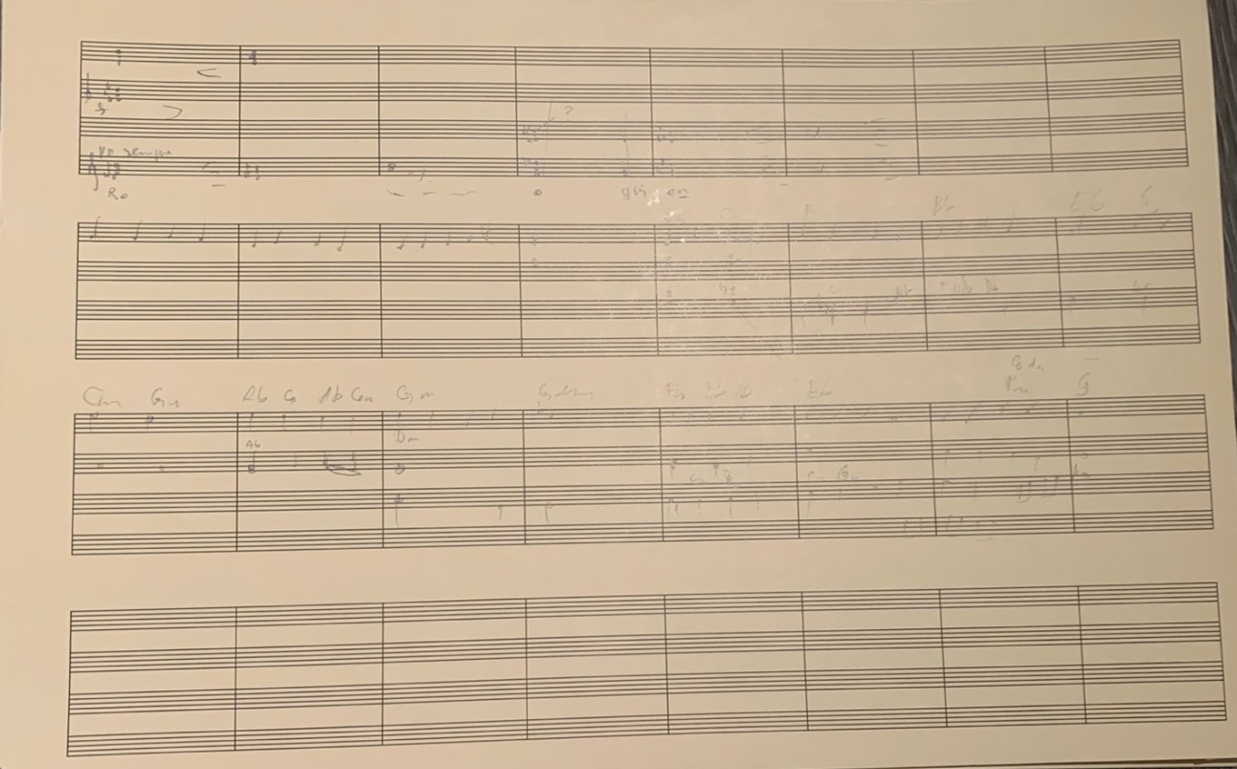 Krigsseilersaken framstår mest som veldig sår og vond. De vant krigen, men tapte freden. Den latinske rekviem-teksten begynner med en bønn om evig hvile. Men sjøfolkene fikk ikke ro. Så jeg lette etter en harmonikk som kunne skape en form for urolig søvn, et mareritt. Mange ville sikkert spilt inn de 38 taktene på mobilen. Men for det første gjemmer jeg ofte telefonen i et annet rom når jeg skriver, for det andre gir record-knappen meg prestasjonsangst selv når jeg er alene, og for det tredje hadde jeg av gammel vane blyant og notepapir i nærheten. Så jeg skisserte det ned. Eksempelet under er denne skissen. Den er ganske glissen, men inneholdt masse informasjon for meg.