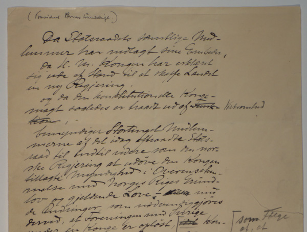 Stortingsarkivet: Stortingspresident Berners notat om oppløsningen av unionen med Sverige 7. juni 1905.
