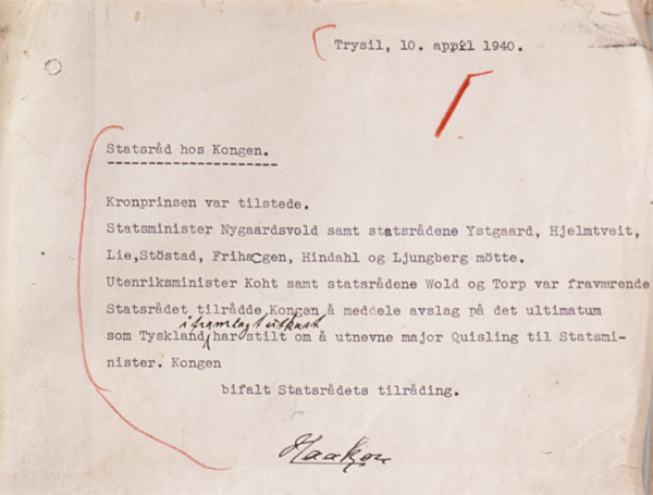 Riksarkivet: Kong Haakon gjorde det klart i statsråd 10. april at han ikke ønsket å etterkomme de tyske kravene om total overgivelse og at Vidkun Quisling skulle utnevnes til statsminister.